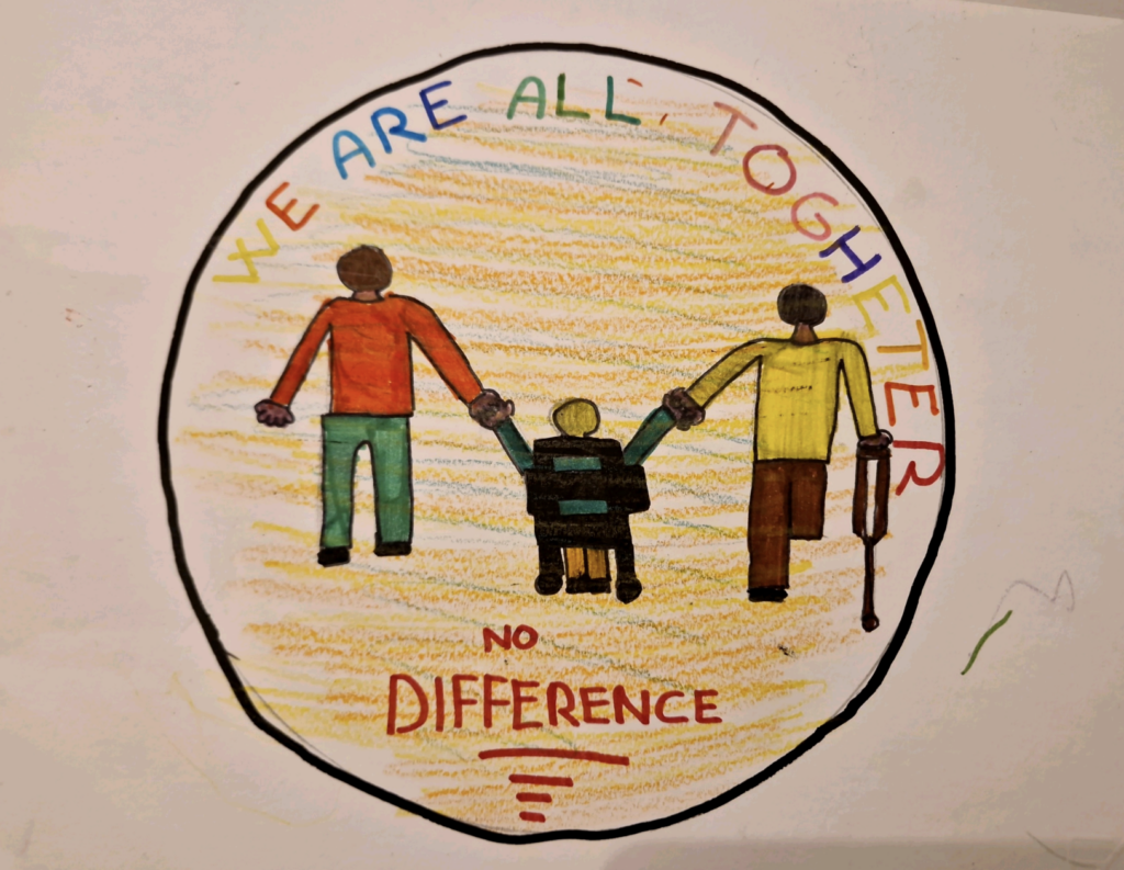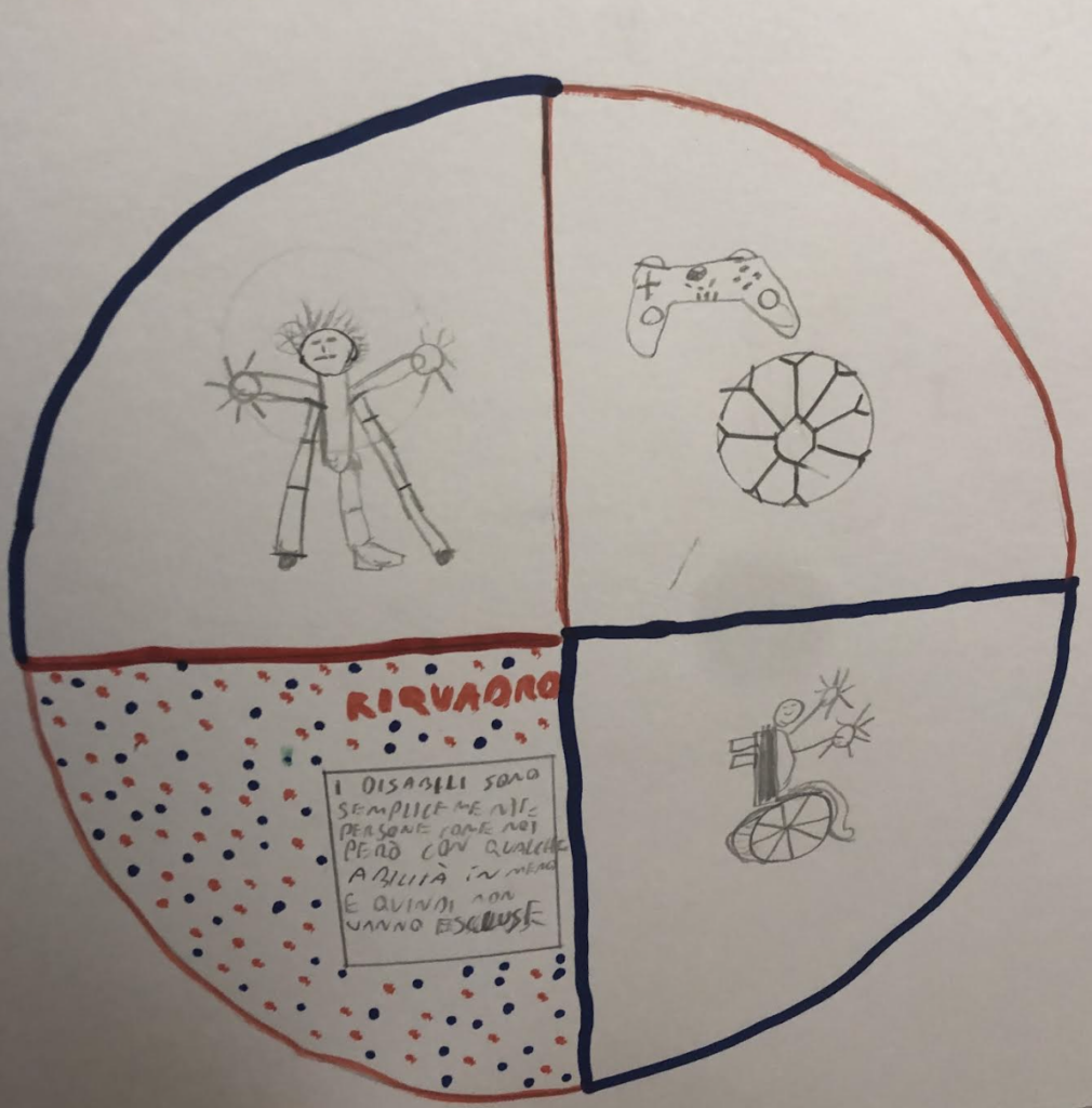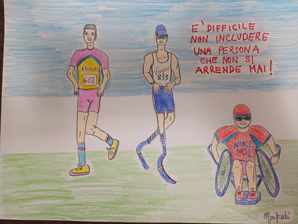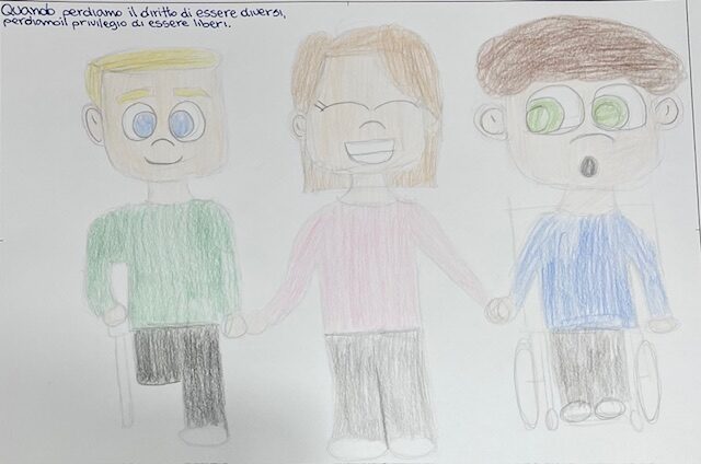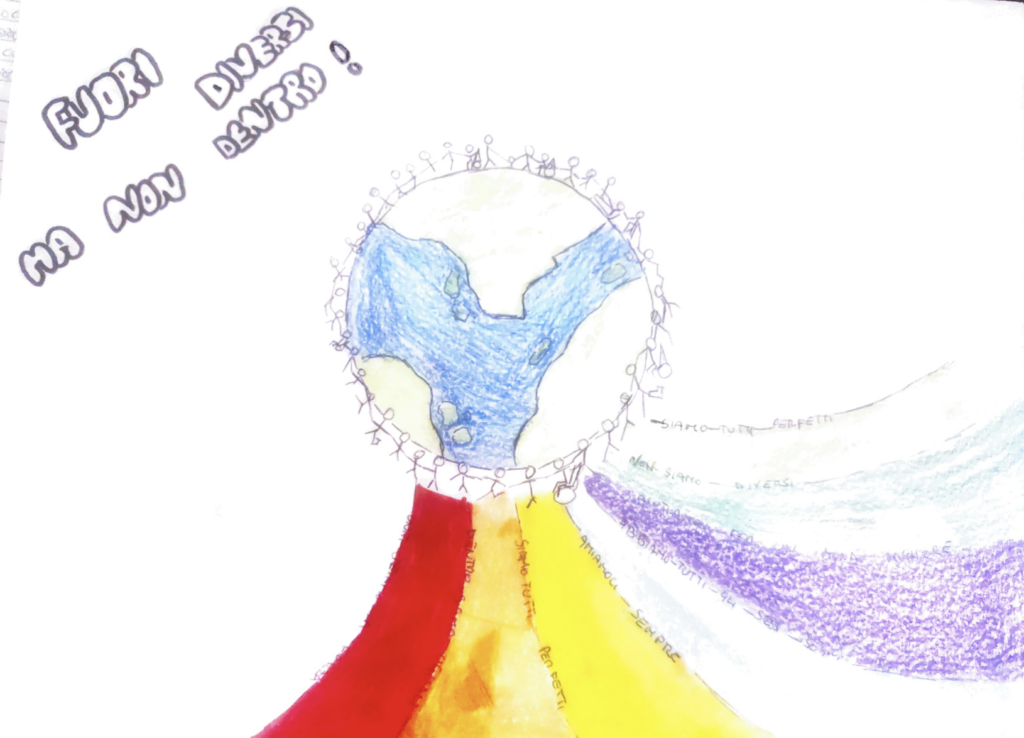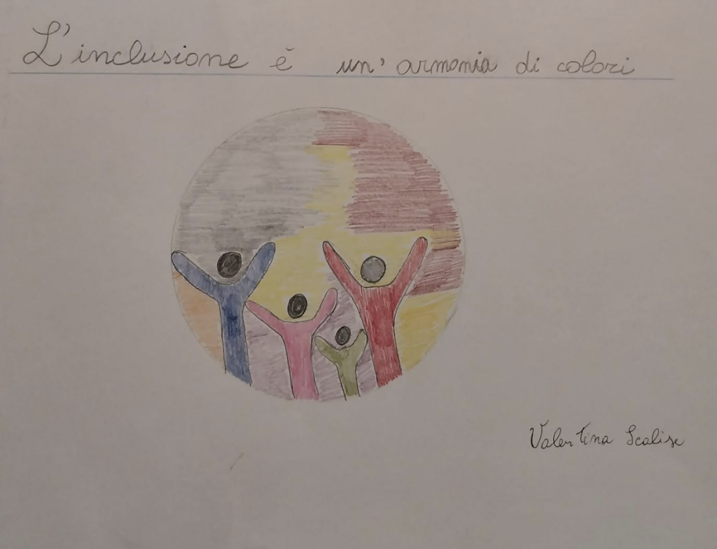 Al termine del dibattito e del confronto fatto in classe, ciascun allievo ha elaborato e proposto una personale visione dell’argomento con un disegno-logo e una frase per sensibilizzare ed educare al valore dell’inclusione.