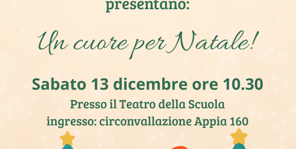Sabato 13 dicembre andrà in scena “Un cuore per Natale!”, uno spettacolo che mette al centro il vero significato del Santo Natale: Dio che viene incontro all’uomo, un invito a fare altrettanto nella quotidianità, accogliendo la diversità, portando gioia e riscoprendo la presenza costante e amorevole di Gesù.